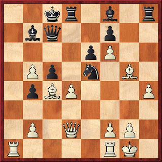 1. d4 d5 2. c4 e6 3. Nc3 c6 4. Nf3 Nf6 5. Bg5 dxc4 6. e4 b5 7. e5 h6 8. Bh4 g5 9. Nxg5 hxg5 10. Bxg5 Nbd7 11. exf6 Qa5 12. Qd2 Bb7 13. Be2 O-O-O 14. O-O c5 15. a4 b4 16. Nb5 a6 17. Bxc4 axb5 18. axb5 Qc7 19. h4 Ne5!-+